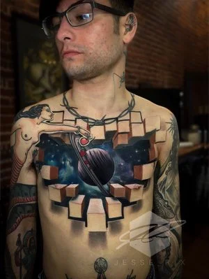 Amazing Artist Jesse Rix Jesse Rix Awesome Childhood Space Dimensional Top Of Mountains Sky Scene Chest Tattoo Jess 3d Tattoo Amazing 3d Tattoos 3d Tattoos